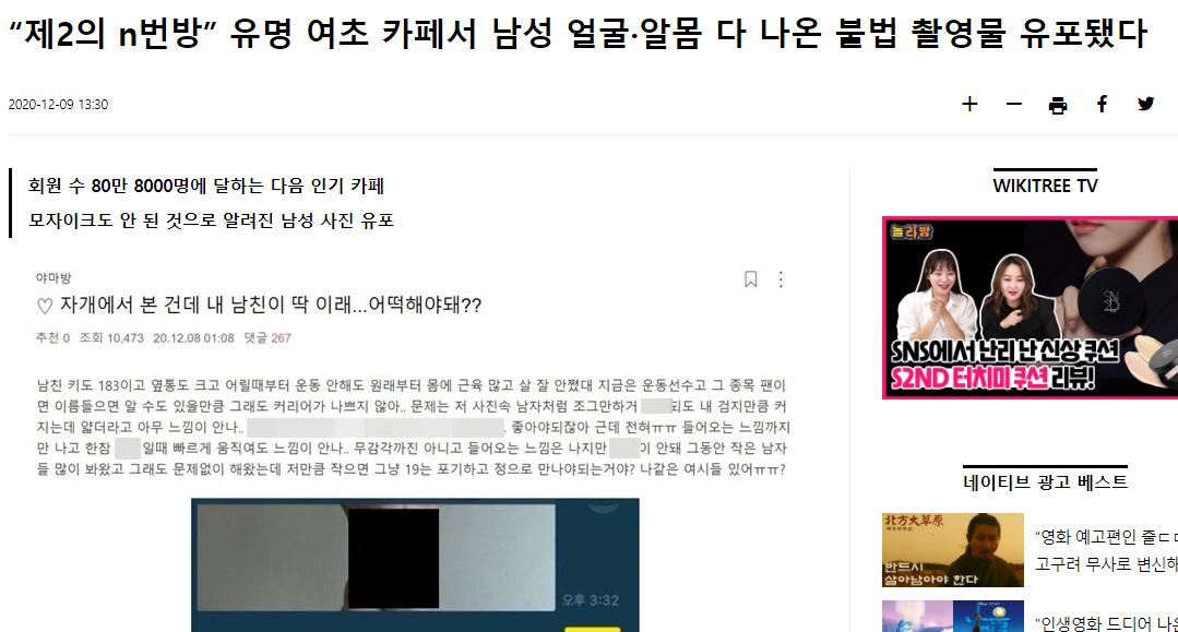 “제2의 n번방” 유명 여초 카페서 남성 얼굴·알몸 다 나온 불법 촬영물 유포됐다
