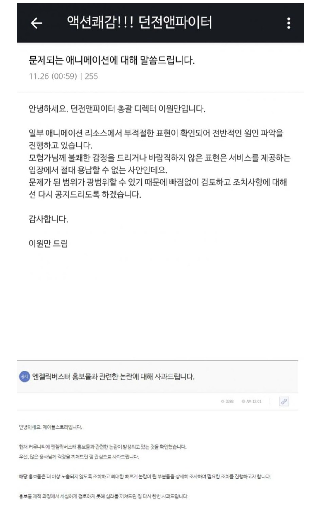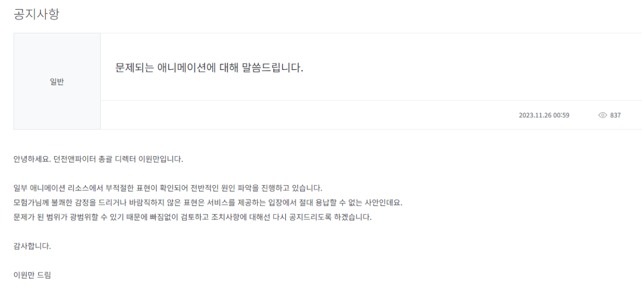 페미관련 던파 디렉터 공지사항 업데이트