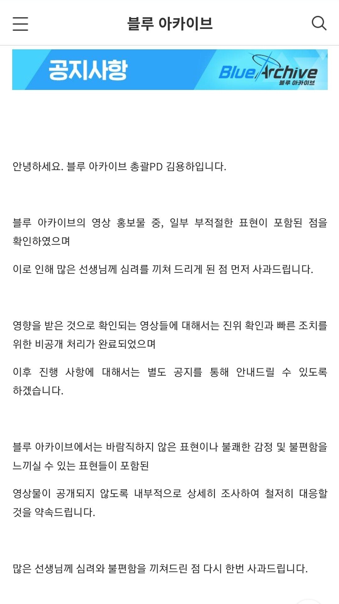 블루아카이브도 페미관련 공지